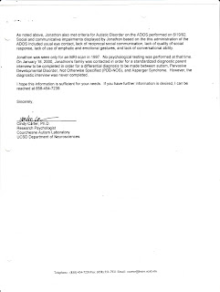However, I recalled I also had paperwork from the Courchesne lab and an evaluation I underwent with Dr. Alan Lincoln that they wrote to use in my disability case of some years ago. Here is the paperwork. The first paper has my social security number on it which I crossed out for obvious reasons. The interested person can see that this is confirmation that my autism was confirmed according to ADOS criteria. At some point, when I can figure out the best way to do it and get Dr. Sapin's earlier letter, I might upload that as well in this or another blog post. I realize this may not satisfy my numerous detractors in the neurodiversity movement, but here is some paperwork on my autism evaluation which I hope will provide some accountability of myself as a genuine autistic person who is not self dxed.