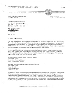 However, when I needed to get on my parents medical plan as a disabled dependent, Samuel Sapin, my former pediatrician who knew me as a toddler in the late fifties when I was severely autistic and unable to talk, wrote a variety of statements to Kaiser so I could get on my parents' medical plan as a disabled dependent. One of these statements goes back to 1985 or earlier which I presented to the California State Department of Rehabilitation when I was getting services from them. Later in 1989, when I was first a research subject of the Courchesne lab, I presented it to them. Later, in 2004, the bureaucrats at Kaiser wanted another letter. I used this when I applied for disability in 2007.